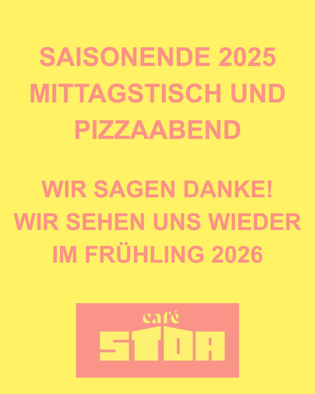 Der Mittagstisch, wie auch die Pizzaabende fallen in den Wintermonaten weg. Ihr könnt gespannt sein, was euch nächsten Frühling erwartet. So viel können wir euch schon verraten: Es wird noch grösser, noch mehr und noch toller!