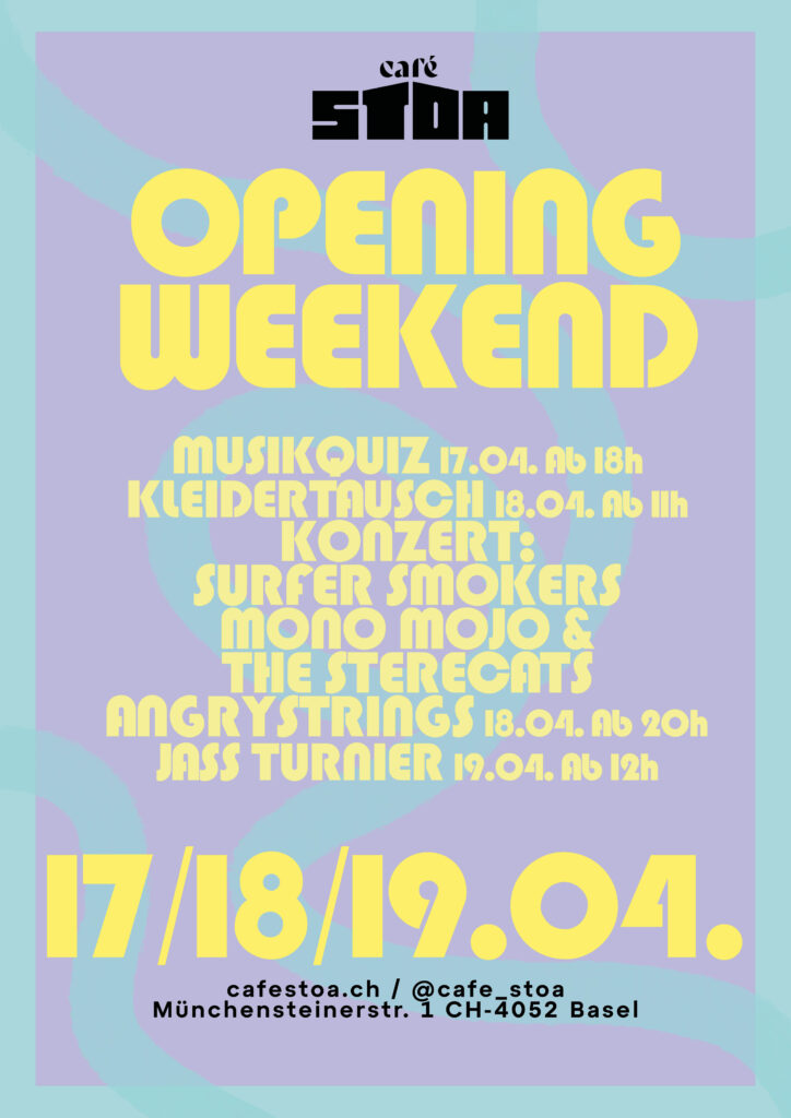 Ab dem 17. April feiern wir unser Eröffnungswochenende mit einem Musikquiz, dem Kleidertausch, Konzerten von The Surfer Smokers, Mono Mojo & the Stereocats sowie den Angry Strings und am Sonntag mit einem Jassturnier.
